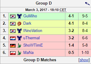 Right after, Gumiho played in the famous Group of D of Death. The Towel Terran first started off with a close series versus the BlizzCon finalist Dark. Despite winning game 1 and a very close game 2, the surprising bio style didn't work against the Zerg in game, losing him the series 1-2. Not wanting to just roll over and die, Gumiho seemed to peak in performance, quickly beating the dutch Terran Uthermal 2-0, dispatching the german Protoss Showtime in a close 2-1-1, forcing a draw on the second map and defeating the IEM gyeonggi champion Innovation 2-1. His final obstacle in the group was the polish Protoss MaNa. He ended up losing the first game on Abyssal Reef, on the following map, Gumiho redoubled his efforts and knocked over his opponent, which he did once again on the next map. Having won all but one of his matches, GumiGod stood at the top of his group with a 9-5 map record.