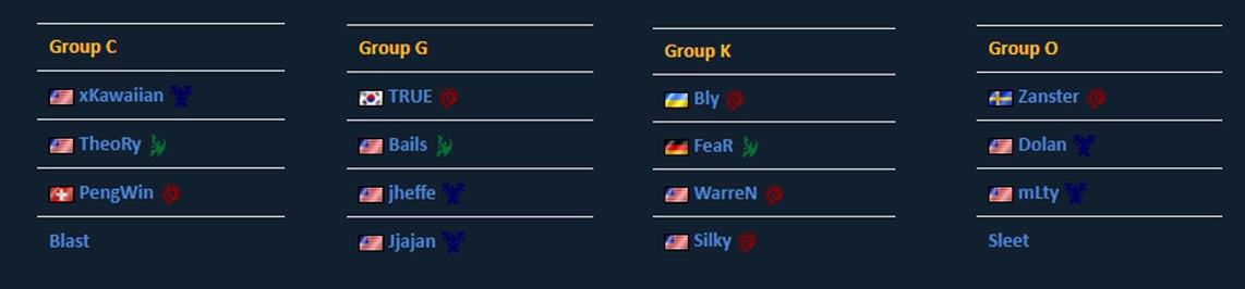 In this bracket, we have TRUE, PengWin, WarreN, Silky and jheffe, battling it out for a top finish in their groups. Somehow, even with 16 groups, we found a way to make a teamkill situation with WarreN and Silky in Group K. They will have to find a way to beat Bly, Fear or even each other to advance into the second Group Stage. All the way back in Group C, our player manager Pengwin, has to best xKawaiian, the Protoss TheorY and Blast to advance. In another potential teamkill situation, TRUE and academy player jheffe have to find a way through Bails and Jjajan to continue on. All by his lonesome, academy player sLeet is in Group O with the Swedish Zanster, Dolan and mLty.